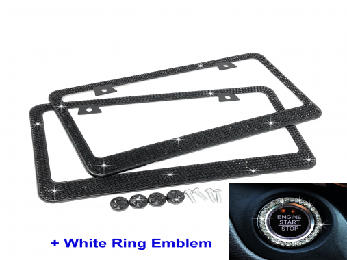 UPDATED 2 PCS Bling Pure Black Crystal-Metal Black License Plate Frame with Two Crystal Cap+White ring Emblem