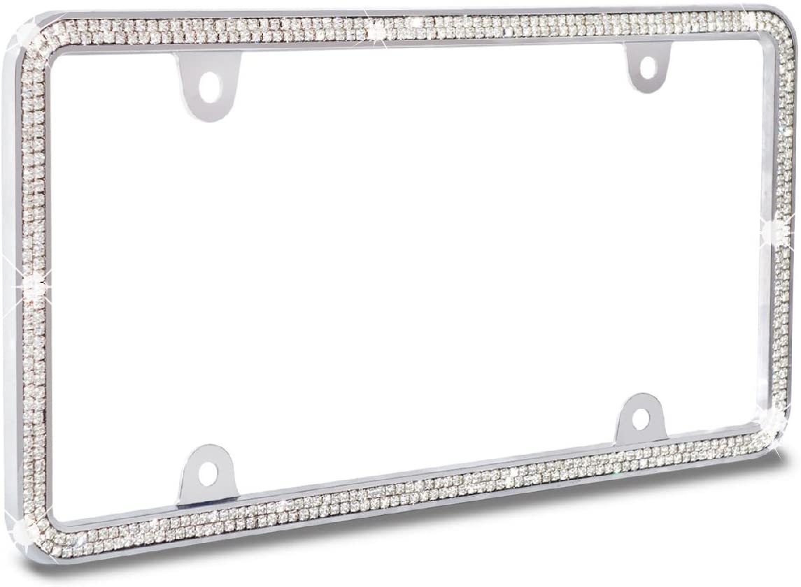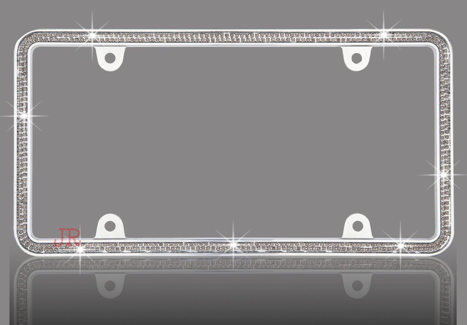 JR2 Shining Double Row Crystal Metal License Plate Frame+Free Screw Caps